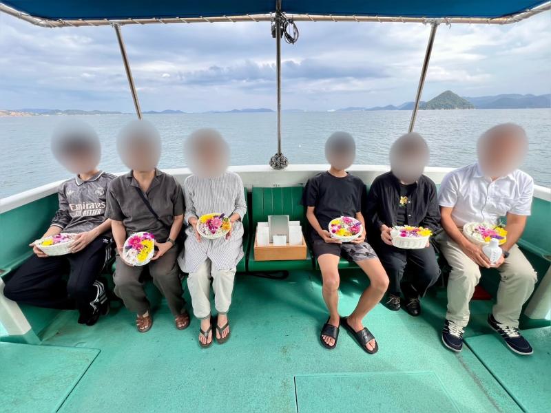 今回は、6名様ご乗船で瀬戸内海、渋川沖で海洋散骨を行わさせていただきました。