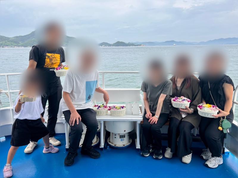 今回は、6名様ご乗船で瀬戸内海、尾道沖で海洋散骨を行わさせていただきました。